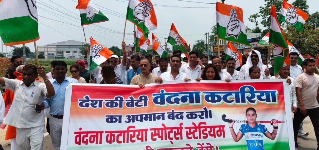 वंदना कटारिया स्पोर्ट्स स्टेडियम के बाहर धरने का 7वां दिन था। जहां से जिला महानगर कांग्रेस कमेटी हरिद्वार के बैनर तले सभी कांग्रेसी पैदल मार्च के साथ जिलाधिकारी कार्यालय पहुंच घेराव कर ज्ञापन सौंपा।।