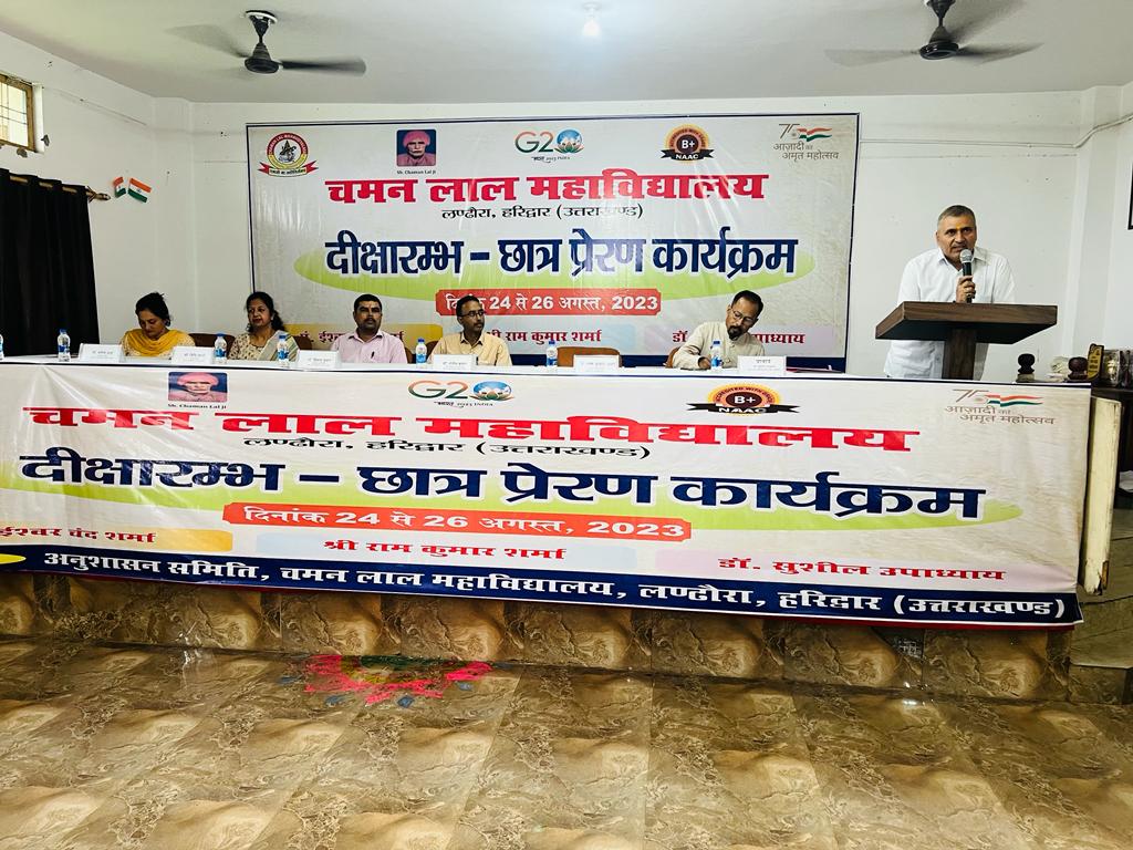 चमन लाल स्नातकोत्तर महाविद्यालय में तीन दिवसीय दीक्षा आरंभ समारोह के उद्घाटन सत्र में महाविद्यालय प्रबंधन समिति के अध्यक्ष श्री रामकुमार शर्मा ने कहा कि पढ़ाई के साथ-साथ अनुशासन और अपने लक्ष्य के प्रति लगन का भाव बेहद महत्वपूर्ण है। उन्होंने नवप्रवेशी छात्र-छात्राओं को सुझाव दिया कि वे अभी से अपना लक्ष्य तय करके उसके अनुरूप तैयारी करें। श्री रामकुमार शर्मा ने शिक्षको का आह्वान किया कि वे इन छात्र-छात्राओं को इस प्रकार शिक्षित एवं दीक्षित करें जिससे यह अपने जीवन में एक अच्छे नागरिक बनने के साथ-साथ देश तथा समाज के विकास में महत्वपूर्ण भूमिका निभा सकें।