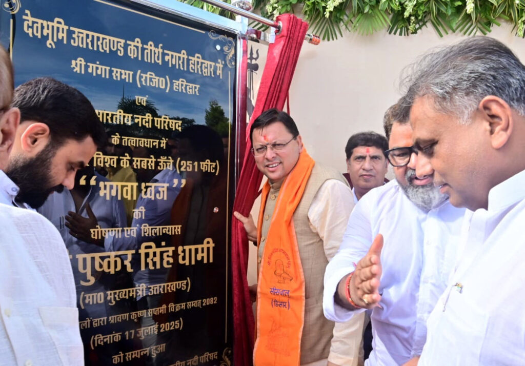 देवभूमि उत्तराखण्ड के तीर्थ नगरी हरिद्वार में गंगा सभा एवं भारतीय नदी परिषद के तत्वधान में गंगा तट पर विश्व के सबसे ऊँचे 25१ फिट भगवा ध्वज की मुख्यमंत्री पुष्कर सिंह धामी ने घोषणा एवं शिलान्यास किया। श्रीगंगा सभा के अध्यक्ष पण्डित नितिन गौतम के सुझाव पर सीएम ने हरिद्वार भगवा ध्वज लगाने की सहमति दी थी। इसी के चलते आज सावन माह के पावन अवसर पर सीएम पुष्कर सिंह धामी ने श्रीगंगा सभा अध्यक्ष नितिन गौतम, सभापति कृष्ण कुमार ठेकेदार व महामंत्री तन्मय वशिष्ठ की मौजूदगी में 25१ फीट ऊंची भगवा ध्वज की घोषणा व शिलान्यास सीएम ने किया।