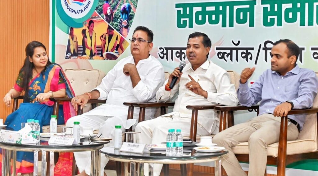 जिलाधिकारी मयूर दीक्षित, जिला पंचायत अध्यक्ष किरण सिंह चौधरी,विधायक रानीपुर आदेश चौहान और मुख्य विकास अधिकारी आकांक्षा कोण्डे ने सम्पूर्णता अभियान सम्मान समारोह का दीप प्रज्वलित कर शुभारंभ विकास भवन सभागार में किया।