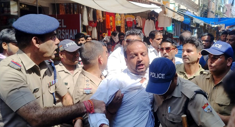 महानगर कांग्रेस अध्यक्ष अमन गर्ग के नेतृत्व में कांग्रेसियों ने मुख्यमंत्री का विरोध करते हुए गौ बैक, कारिडोर पर जवाब दो, जीएसटी की लूट का हिसाब दो के नारे लगाते हुए हरिद्वार मंडी चौक से हरकी पैड$ी की तरफ कूच करने लगे। अचानक हुए विरोध प्रदर्शन के चलते पुलिस प्रशासन के हाथ पांव फूल गए। पुलिस ने कार्यकर्ताआें को रोकने का प्रयास किया। इस दौरान पुलिस और कांग्रेस कार्यकर्ताआें में तीखी नोंकझोंक भी हुई। बाद में पुलिस ने सभी को गिरफ्तार कर लिया और पुलिस लाइन ले गयी।