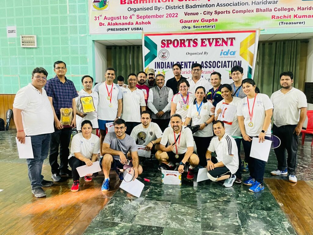 इंडियन डेंटल एसोसिएशन हरिद्वार शाखा ने हरिद्वार एवं रुड़की के दंत चिकित्सकों का बैडमिंटन टूर्नामेंट का आयोजन सिटी स्पोर्ट्स कंपलेक्स में किया गया । जिसमे कुल 5 फॉर्मेट में मैच खेले गए जिसमे 40 डॉक्टरो ने प्रतिभाग लिया । जिसमे पुरुष सिंगल सेमी फाइनल में रोमांचक मैच में डॉ नीरज ने फाइनल में जीत दर्ज की । महिला सिंगिल में डॉ आरुषि ने जीत दर्ज की , पुरुष डबल में डॉ नीरज , डॉ गगन ने जीत दर्ज की , महिला डबल में डॉ प्रियंका , डॉ सिन्की , मिक्स डबल में डॉ आरुषि व डॉ आकाश ने जीत दर्ज की ।