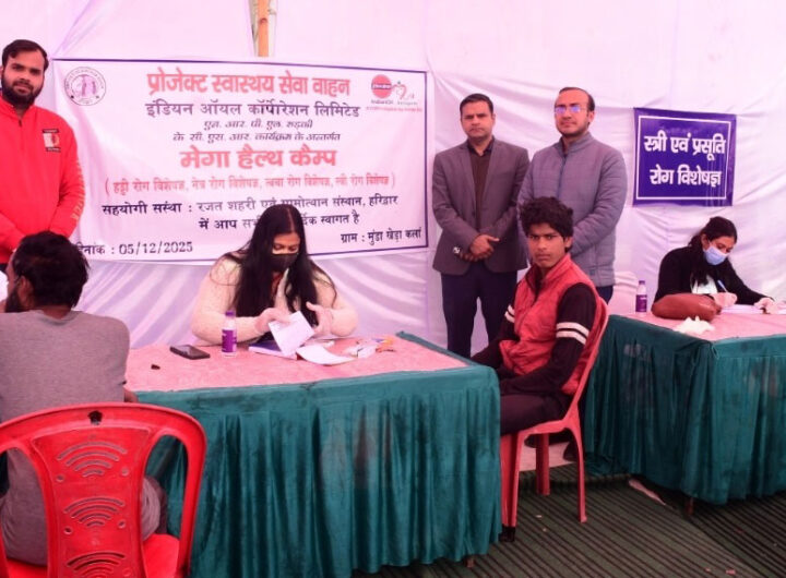 -निशुल्क परामर्श व दवाइयों का किया वितरण -इण्डियन आयल के हेल्थ चेकअप कैम्प में जांच कराते ग्रामीण।...